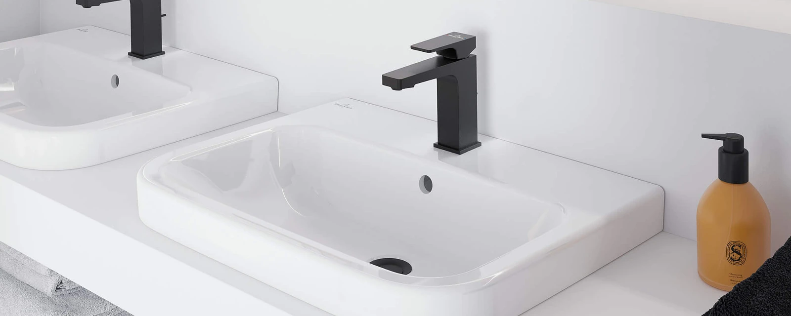 Los lavabos de encastre se integran en la encimera formando una equilibrada unidad. Solo la parte interna del lavabo y la grifería permanecen visibles.